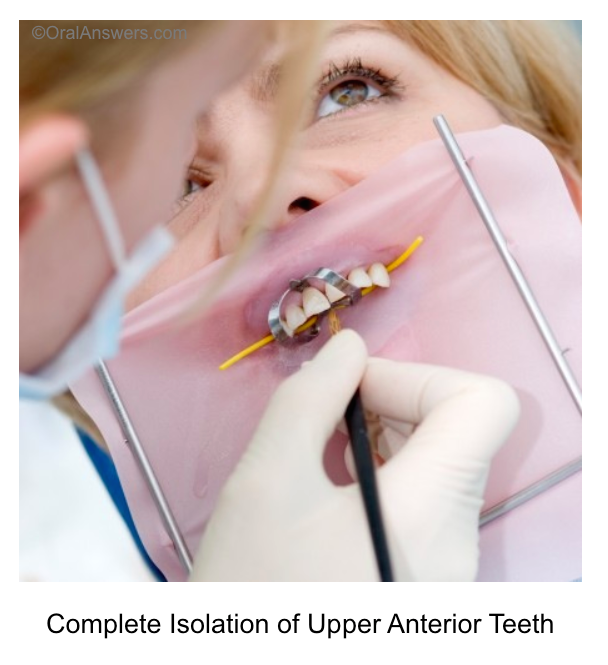 – Clean and moisture-free operating field (saliva, blood). For dental procedures involving bonding with adhesives or cements it is to be encouraged as the operative field must avoid contamination in order to achieve maximum bond strength between restorative material, enamel and dentin. One of the main functions of saliva is to coat the oral tissues to protect them. When a jet of air from a dental hand-piece is used to dry a part of the mouth, this stimulates salivary flow and there is an instinctive reaction to lick the dry area to make it wet with saliva again. This is avoided as the tongue and the output of the salivary glands are on the other side of the dam.
